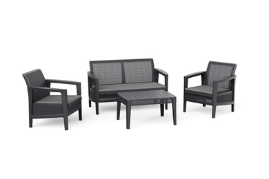 The set includes two armchairs, a two-seater sofa, and a practical coffee table—a set that allows you to create a comfortable and functional space for relaxation.
