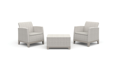 The Scandi Forma lounge set includes two armchairs and a table with storage space, creating a cohesive and comfortable set that facilitates order and ensures comfortable outdoor relaxation.