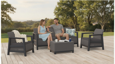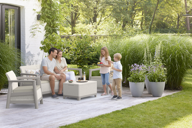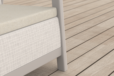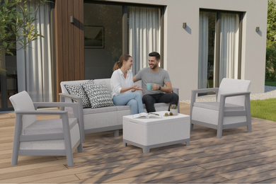 The Scandi Linea lounge set combines natural aesthetics with the comfort of everyday use. The decorative jute-inspired structure gives the furniture a distinctive, natural character and makes the set fit harmoniously into terraces, balconies, and gardens.