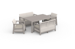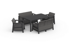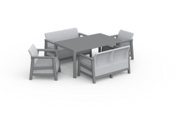 The Scandi Linea Fiesta set includes two two-seater sofas, two comfortable armchairs, and a spacious dining table – a set that combines lounge and dining functions, creating a comfortable, stylish place for spending time together outdoors.