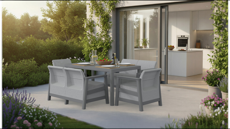 Moisture-, rain-, and UV-resistant materials help maintain the set's aesthetic appeal for many seasons.